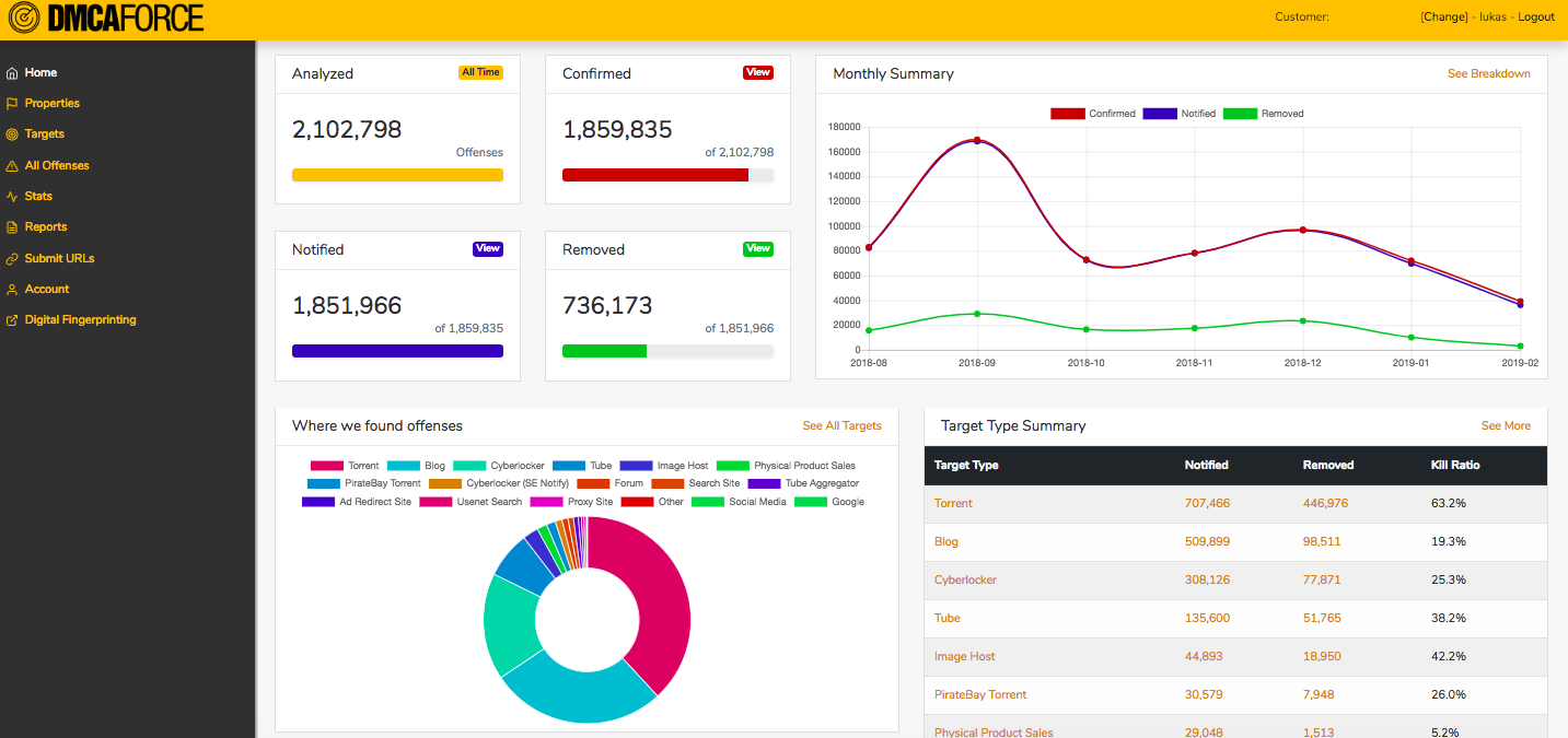 DMCA starts 2019 off BIG, launching it’s new client’s interface. With a simple and clean look, it shows all the data in one clean sleek dashboard. You can find right on the dashboard key metrics such as; a monthly summary of offenses found, analyzed, confirmed, notified, and removed or taken down, all in one place. We give you charts on the types of offending sites, frequency, and data you need to see your piracy impact in real time.